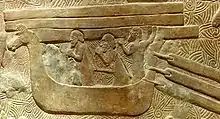 Ships with a horsehead decoration, perhaps cult ships, are also represented in artifacts of the Minoan/Mycenaean era;[21][22] the image[23] on a seal found in the palace of Knossos, dated around 1200 BC, which depicts a ship with oarsmen and a superimposed horse figure, originally interpreted as a representation of horse transport by sea,[24] may in fact be related to this kind of vessels, and even be considered as the first (pre-literary) representation of the Trojan Horse episode.[25]