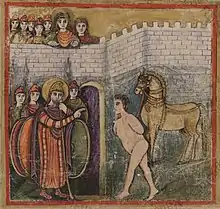 While questioning Sinon, the Trojan priest Laocoön guesses the plot and warns the Trojans, in Virgil's famous line Timeo Danaos et dona ferentes ("I fear Greeks, even those bearing gifts"),[6] Danai (acc Danaos) or Danaans (Homer's name for the Greeks) being the ones who had built the Trojan Horse. However, the god Poseidon sends two sea serpents to strangle him and his sons Antiphantes and Thymbraeus before any Trojan heeds his warning. According to Apollodorus the two serpents were sent by Apollo, whom Laocoön had insulted by sleeping with his wife in front of the "divine image".[7] In the Odyssey, Homer says that Helen of Troy also guesses the plot and tries to trick and uncover the Greek soldiers inside the horse by imitating the voices of their wives, and Anticlus attempts to answer, but Odysseus shuts his mouth with his hand.[8] King Priam's daughter Cassandra, the soothsayer of Troy, insists that the horse will be the downfall of the city and its royal family. She too is ignored, hence their doom and loss of the war.[9]