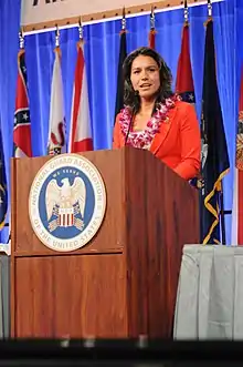 Tulsi Gabbard (/ˈtʌlsi ˈɡæbərd/; born April 12, 1981) is an American politician, United States Army Reserve officer and political commentator who served as the U.S. representative for Hawaii's 2nd congressional district from 2013 to 2021. Gabbard was the first Hindu member of Congress and also the first Samoan-American voting member of Congress. She was a candidate for the Democratic nomination in the 2020 United States presidential election,[2][3] In October 2022, Gabbard announced that she had quit the Democratic Party and become independent.[1][4]