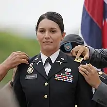Gabbard is a recipient of the Combat Medical Badge and the Meritorious Service Medal.[72] On October 12, 2015, she was promoted from the rank of captain to major at a ceremony at the National Memorial Cemetery of the Pacific.[73][74] She continued to serve as a major in the Hawaii Army National Guard until her transfer to the 351st Civil Affairs Command, a California-based United States Army Reserve unit assigned to the United States Army Civil Affairs and Psychological Operations Command, in June 2020.[75][76]