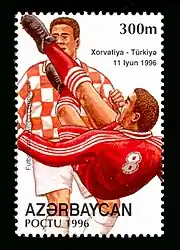 Turkish national football team on an Azerbaijan stamp for Euro 1996.