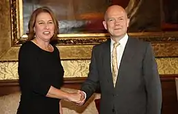 From 2001 to 2009, Livni served in the cabinets of Ariel Sharon and Ehud Olmert, most notably as Israel's foreign minister, during which time she led multiple rounds of peace talks with the Palestinians. In September 2008, Livni prepared to take office as Prime Minister of Israel, but the political climate in the country prevented her from forming a government. The following year, she led her party to win a plurality of seats in the Knesset, but was again blocked from becoming prime minister, due to the rightist parties' majority in the Knesset. Consequently, she served as Leader of the Opposition from 2009, until her resignation from the Knesset in 2012.[18]