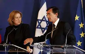 After a draft document authored by Sweden (the then-holder of the rotating EU presidency) surfaced that calls officially for a division of Jerusalem and implies that the EU would also recognize a unilateral Palestinian declaration of statehood, Livni wrote a letter to Swedish Foreign Minister Carl Bildt, saying it was "wrong and not helpful," and that she conveyed "deep concern regarding what appears to be an attempt to prejudge the outcome of issues reserved for final status negotiations." European efforts to "dictate for either party the nature of the outcome on the status of Jerusalem," she said, would only serve to endanger the fulfillment of "our shared vision of two states for two peoples into a reality."[87] Livni also called on France to speak up against the draft during her meeting with Sarkozy in Paris.[88]