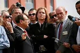 Livni led the Israeli negotiation team in the peace talks, brokered by U.S. Secretary of State John Kerry and Middle East envoy Martin Indyk from July 2013 until April 2014. Upon announcing the resumption of talks between Israel and the Palestinians at a press conference delivered at the U.S. State Department, Livni criticized the "cynicism and pessimism" surrounding Israeli–Palestinian peace process, and expressed hope that the negotiators would do everything in their power to transform a "spark of hope into something real and lasting." In concluding remarks praised for their poignancy, she said, "I believe that history is not made by cynics. It is made by realists who are not afraid to dream. And let us be these people."[108] The process collapsed in April 2014 when internal political difficulties prevented Israel from releasing a promised fourth tranche of pre-Oslo prisoners and the Palestinians reacted by acceding to several international treaties.[109] Indyk cited Israel's settlement policy during the talks as a critical factor leading to the collapse.[110]