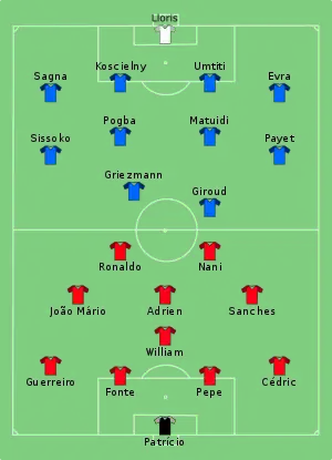France's starting line-up was unchanged from the semi-final, while Portugal brought back Pepe and William Carvalho, who missed the semi-final through injury and suspension respectively, for Bruno Alves and Danilo. France adopted a 4–2–3–1 formation while Portugal played as a 4–1–3–2.[22] Before the match, Portugal's manager, Fernando Santos reacted to the criticism his side had received during the tournament, stating "I want it to continue ... I want us to win [the final] without deserving it!"[42]