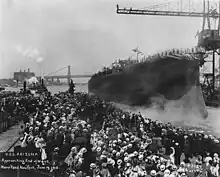 The New York Times estimated that 75,000 people attended the launch, including John Purroy Mitchel, the mayor of New York City, George W. P. Hunt, the governor of Arizona, and many high-ranking military officials. Several warships were also nearby, including many of the new dreadnoughts which had already entered service (Florida, Utah, Wyoming, Arkansas, New York, and Texas). Esther Ross, the daughter of W. W. Ross of Prescott, Arizona, was given the honors of ship sponsor and christening.[16][17] To acknowledge a ban on alcohol recently passed by the state legislature, the state's governor decided that two bottles would be used: one full of sparkling wine from Ohio, and another filled with water from the Roosevelt Dam. After the launch, Arizona was towed to the Brooklyn Navy Yard for fitting-out.[16]