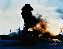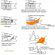 Two competing hypotheses have arisen about the cause of the explosion. The first is that the bomb detonated in or near the black-powder magazine used for the ship's saluting guns and catapult charges. This would have detonated first and then ignited the smokeless powder magazines which were used for the ship's main armament. A 1944 Navy Bureau of Ships report suggests that a hatch leading to the black powder magazine was left open, possibly with flammable materials stocked nearby. The Naval History and Heritage Command explained that black powder might have been stockpiled outside the armored magazine. The alternative explanation is that the bomb penetrated the armored decks and detonated directly inside one of the starboard magazines for the main armament, but smokeless powder is relatively difficult to detonate. Thus the 14-inch powder bags required a black powder pad to quickly ignite the powder. The time elapsed from the bomb hit to the magazine explosion was shorter than experience suggested burning smokeless powder required to explode.[53] It seems unlikely that a definitive answer to this question will ever be found, as the surviving physical evidence is insufficient to determine the cause of the magazine explosion.[50][54]