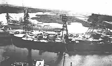 Arizona left the yard on 3 April 1917,[21] and three days later, the United States declared war on Germany. Assigned to Battleship Division 8 operating out of the York River,[21][22] Arizona was employed only as a gunnery training ship for the crewmen on armed merchant vessels crossing the Atlantic in convoys. Shortly after the war began, eight of her 5-inch guns (the four guns farthest forward and the sternmost four guns) were removed to equip merchant ships. When the ship sailed near the wreck of the old San Marcos (ex-Texas), the wreck was sometimes used as a target for the 14-inch guns. Arizona rarely ventured into the ocean for fear of U-boats, and when she did, it was only in the company of other battleships and escort ships. Four coal-fired American dreadnoughts (it was easier to obtain coal than oil in the United Kingdom) were eventually sent across the Atlantic in December 1917 as Battleship Division Nine, but Arizona was not among them. Life for Arizona's crew was not all training, as the race-boat team from Arizona was able to win the Battenberg Cup in July 1918 by beating the team from Nevada by three lengths over the three-mile course.[23]