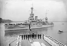 The United States declared war on Germany on 6 April 1917, joining the Allied Powers in World War I. Arkansas was at the time assigned to Battleship Division 7 stationed in Virginia. The ship patrolled the east coast and trained gun crews for the next fourteen months.[2] The ship was sent to Britain in July 1918 to relieve the battleship Delaware, which had been assigned to operate with the Grand Fleet in the 6th Battle Squadron since December 1917.[5] Arkansas departed the United States on 14 July; while approaching the Royal Navy base in Rosyth, the battleship fired on what was thought to be a periscope from a German U-boat. The destroyers escorting Arkansas dropped depth charges but did not hit the alleged submarine. Arkansas arrived in Rosyth on 28 July, and joined the rest of Battleship Division 9 stationed there. For the remainder of the conflict, Battleship Division 9 operated as the 6th Battle Squadron of the Grand Fleet.[2][6]