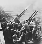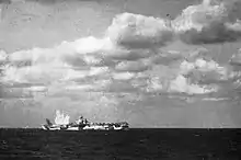 The task group was too far away to intervene when the Japanese surprised the American escort carriers off the coast of Samar on the morning of 25 October with their force of battleships and cruisers, but McCain's carriers were able to close the distance enough by the early afternoon to launch two long-range airstrikes that accomplished little. The Americans lost 14 aircraft to all causes and failed to significantly damage any of Vice Admiral Takeo Kurita's ships. The following morning, after TG 38.1 and 38.2 rendezvoused, they launched an 257-aircraft airstrike that attacked Kurita's ships.[48] Avengers from Hornet and Cowpens hit the light cruiser Noshiro with one bomb that started a quickly extinguished fire. About twenty minutes later another Avenger put a torpedo into the cruiser; the detonation disabled all of her boilers and left her dead in the water. About an hour and a half after that, 28 of Hornet's Avengers and Helldivers hit Noshiro again with a torpedo and she sank an hour later.[49]