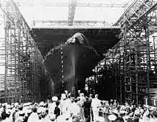 The Chief of Naval Operations had ordered three Essex-class carriers on 10 May 1940 in anticipation of Congress passing the Two-Ocean Navy Act,[15] although the ship that later became Hornet originally had the name Kearsarge with the hull number of CV-12. The contract to build her was awarded to Newport News Shipbuilding on 9 September 1940, and her keel was laid down on 3 August 1942. The seventh Hornet (CV-8) was sunk in the Battle of Santa Cruz on 26 October 1942, and the CV-12 hull was renamed Hornet shortly afterwards.[16] The ship was launched on 30 August 1943 with her sponsor being Annie Reid Knox, wife of Secretary of the Navy Frank Knox. She was commissioned on 29 November 1943 with Captain Miles R. Browning in command.[1]