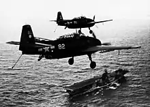 As Task Force 58 approached its targets on the morning of 30 March, its carriers launched a fighter sweep that shot down 30 Mitsubishi A6M Zero fighters already airborne and they were soon followed by 39 Grumman TBF Avenger torpedo bombers, each of which carried a pair of magnetic mines that effectively bottled up the 40-odd ships in Kossol Roads.[18] This was the first and only time that carrier aircraft laid mines during the Pacific War.[19] Despite reinforcing fighters that flew in overnight, the Americans sank 24 merchant and auxiliary ships, totaling nearly 130,000 gross register tons (GRT) of shipping, plus two old destroyers, four subchasers and a pair of repair ships on 30 and 31 March. American pilots claimed to have shot down 63 aircraft and destroyed over 100 more on the ground while losing 25 aircraft of their own. On their way back to Majuro, the carriers attacked targets on Woleai on 1 April to little effect.[20]