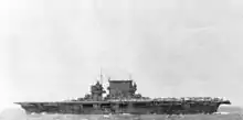 While under repair after being torpedoed on 11 January 1942, Saratoga received a 7-foot-2-inch (2.2 m) bulge on the starboard side of her hull.[36] This was primarily intended to increase the ship's buoyancy, improve stability and allow her full fuel capacity to be utilized. The bulge was estimated to increase her metacentric height by 3 feet (0.9 m) and decrease her speed by one-quarter of a knot.[37] It was also used to store additional fuel oil and increased her capacity to a total of 9,748 long tons (9,904 t).[22] At the same time, her funnel was shortened by 20 feet (6.1 m) and her tripod foremast was replaced by a light pole mast to reduce her topweight.[38]