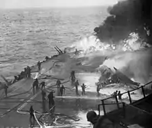 While under repair, the ship was modernized with an anti-torpedo bulge, her anti-aircraft armament was significantly upgraded and more radars were added.[38] Douglas was relieved on 12 April and Saratoga was temporarily commanded by her executive officer, Commander Alfred M. Pride, until Captain DeWitt Ramsey assumed command a month later.[64] Saratoga departed from Bremerton on 22 May, bound for San Diego. She arrived there on 25 May and began loading aircraft and supplies while waiting for her task force commander, Admiral Fitch, to arrive from the South Pacific. On 30 May Admiral Nimitz, now commander-in-chief of the United States Pacific Fleet, ordered Captain Ramsey to expedite his departure for Pearl Harbor, even if Fitch had not yet arrived. The ship sailed from San Diego on 1 June carrying 14 Wildcats of VF-2 Detachment and 23 Dauntlesses of VS-3; in addition she carried four Wildcats, 43 Dauntlesses and 14 Avengers as cargo. She arrived at Pearl Harbor on 6 June, the final day of the Battle of Midway. After refuelling, Saratoga departed the following day with the mission to ferry replacement aircraft to the carriers that survived the battle. The ship carried a total of 47 Wildcats, 45 Dauntlesses, five Devastators and 10 Avengers, including her own air group.[65] Admiral Fletcher (whose flagship Yorktown had been sunk during the battle) came aboard on 8 June and made Saratoga his flagship.[66] The ship rendezvoused with the other carriers on 11 June and transferred 19 Dauntlesses, the five Devastators and all of the Avengers to them.[67] When the ship reached Pearl on 13 June, Fletcher and his staff disembarked; Admiral Fitch rendezvoused with the ship the next day. He became commander of Task Force 11 on 15 June, when Nimitz reorganized his carriers. From 22 through 29 June, Saratoga ferried 18 Marine Dauntlesses of VMSB-231 and 25 Army Air Corps Curtiss P-40 Warhawks to Midway Island to replace the aircraft lost during the battle. Fletcher relieved Fitch as commander of TF 11 the following day.[68]