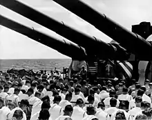 On 19 April, South Dakota was detached from the carriers to join a shore bombardment group sent to support a major offensive by XXIV Army Corps against Japanese defensive positions in southern Okinawa, though they made little progress. The ships of TF 58 then departed for a raid on the Sakishima Islands before withdrawing to Leyte. After replenishing there, the task groups resumed their rotations off Okinawa for the next week.[36] On 6 May, South Dakota was replenishing ammunition from the ammunition ship USS Wrangell when a tank of propellant for the 16 in (410 mm) guns exploded. The blast detonated four more tanks and caused a serious fire, forcing the crew to flood the magazine for turret number 2 to avoid a catastrophic explosion. Three men were killed by the explosion and eight more were seriously wounded and later died; another twenty-four were less-seriously injured in the accident.[37]