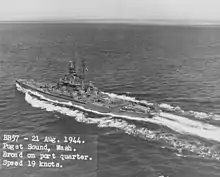 South Dakota turned to the east on 22 June; with the 1st Mobile Fleet having been badly mauled by Mitscher's carrier strike, the invasion fleet off the Marianas was no longer under significant threat and the battleships of TG 58.7 could withdraw from the area. South Dakota was transferred to TG 58.2 and sent to Eniwetok on 23 June, arriving there four days later. From there, she got underway for Puget Sound by way of Pearl Harbor; while in Pearl Harbor on 2 July, she embarked a group of 248 wounded, 279 sailors, and 90 marines to carry them to the mainland. She reached Puget Sound on 10 July and disembarked her passengers and her own wounded crewmen the next day. She was then dry-docked for repairs that evening. The work was completed by 6 August and after being re-floated, she loaded ammunition on 19 August. Sea trials began two days later. She was then assigned to Task Unit (TU) 12.5.1 in company with a pair of destroyers on 25 August, departing for Pearl Harbor, which she reached on the last day of the month.[27]