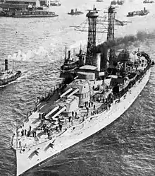 She returned to New York early in 1929 for her annual overhaul and had completed it by March when she began another brief tour of duty in the Pacific. She returned to the Atlantic in June and resumed normal duty with the Scouting Fleet. In April 1930, she took time from her operating schedule to escort Leviathan into New York when that ship carried the returning U.S. delegation to the London Naval Conference. In January 1931, she left the yard at New York as flagship of the United States Fleet and headed via the Panama Canal to San Diego, California, and then on to Los Angeles (port of San Pedro) which became her home port for the next six years and three months.[39][40] There would be a temporary redeployment back to the Atlantic from April to October 1934.[41] During this Pacific period, she served first as flagship for the entire Fleet and, later, as flagship for Battleship Division 1.[7]