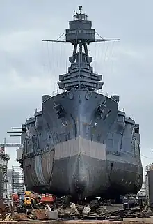 Texas was the first U.S. battleship to become a permanent museum ship.[A 2][6] In 1976 she became the first battleship to be declared a U.S. National Historic Landmark,[8] and is the only remaining World War I era dreadnought battleship. She is also one of the eight remaining ships and the only remaining capital ship to have served in both World Wars.[9][A 3] Texas is owned by the people of Texas and is officially under the jurisdiction of the Texas Parks and Wildlife Department. Everyday operations and maintenance of Texas has been handled by the non-profit organization Battleship Texas Foundation since August 2020.[10][11] At the end of August 2022 she was moved to a dry dock in Galveston, Texas to undergo a $35 million dollar repair project. As of August 2023, the repair project is still underway.[12]