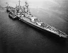 The ship was armed with a main battery of nine 16 in /45 caliber Mark 6 guns[lower-alpha 1] guns in three triple-gun turrets on the centerline, two of which were placed in a superfiring pair forward, with the third aft. The secondary battery consisted of twenty 5 in (127 mm) /38 caliber dual purpose guns mounted in twin turrets clustered amidships, five turrets on either side. As designed, the ship was equipped with an anti-aircraft battery of sixteen 1.1 in (28 mm) guns and eighteen .50-caliber (12.7 mm) M2 Browning machine guns,[lower-alpha 2] but her anti-aircraft battery was expanded greatly during her career.[2][3]