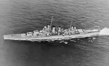 Shortly after repairs were completed, Wichita was transferred to the Pacific theater.[5] She was assigned to Task Force 18, commanded by Rear Admiral Giffen, and tasked with operations off Guadalcanal. She was joined by the heavy cruisers Louisville and Chicago, the light cruisers Montpelier, Cleveland, and Columbia. In addition, the escort carriers Chenango and Suwannee, and eight destroyers were present in the task group.[26] On the night of 29 January 1943, the Task Force was steaming off Rennell Island; wary of the threat from Japanese submarines, which Allied intelligence indicated were likely in the area, Giffen arranged his cruisers and destroyers for anti-submarine defense, not expecting an air attack. The cruisers were aligned in two columns, spaced 2,500 yd (2,300 m) apart. Wichita, Chicago, and Louisville, in that order, were to starboard, and Montpelier, Cleveland, and Columbia were to port. The six destroyers were in a semicircle 2 mi (1.7 nmi; 3.2 km) ahead of the cruiser columns.[27] That evening, the ships came under attack from Japanese torpedo bombers. In the ensuing Battle of Rennell Island, Chicago was hit by several torpedoes and sunk; Wichita was hit by one torpedo, though it failed to explode.[28]