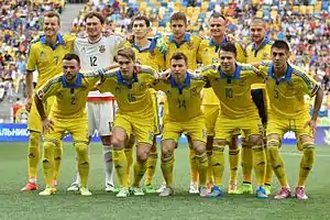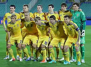 The national team was formed in the early 1990s and was recognized internationally soon afterwards. It is not widely known, however, that Ukraine previously had a national team in 1925–1935.[3][4] Just like the Russian Soviet Federative Socialist Republic, the Ukrainian Soviet Socialist Republic had its own national team. The national team included such players Andriy Ponomarenko, Ivan Privalov, Volodymyr Fomin, H. Syrota, Mykola Fomin, Anatoliy Lisnyi, Oleksandr Shatokha (goalkeeper), Dmytro Kyryllov, Dmytro Starusev, Serhiy Kopeiko, Petro Parovyshnykov (first team); Valentyn Prokofyev, Fedir Tyutchev, H. Yakubovskyi, Ivan Vladymyrskyi, Serafim Moskvin (goalkeeper), Kazymyr Piontkovskyi, Mykhailo Pashuta, Vasiliy Yepishin, Adam Bem, K. Us, Volodymyr Prasolov (second team).[5][6]