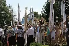 Ukrainians (Ukrainian: українці, romanized: ukraintsi, pronounced [ʊkrɐˈjinʲts⁽ʲ⁾i])[49] are an East Slavic ethnic group native to Ukraine. The native language of the Ukrainians is Ukrainian. The majority of Ukrainians are Eastern Orthodox Christians, some Ukrainians are also Catholic Christians.