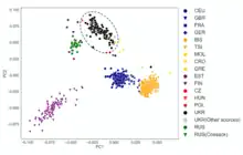 Roughly all R1a Ukrainians carry R1a-Z282; R1a-Z282 has been found significantly only in Eastern Europe.[100] Chernivtsi Oblast is the only region in Ukraine where Haplogroup I2a occurs more frequently than R1a, much less frequent even in Ivano-Frankivsk Oblast.[101] In comparison to their northern and eastern neighbors, Ukrainians have a similar percentage of Haplogroup R1a-Z280 (43%) in their population—compare Belarusians, Russians, and Lithuanians and (55%, 46%, and 42% respectively). Populations in Eastern Europe which have never been Slavic do as well. Ukrainians in Chernivtsi Oblast (near the Romanian border) have a higher percentage of I2a as opposed to R1a, which is typical of the Balkan region, but a smaller percentage than Russians of the N1c1 lineage found among Finnic, Baltic, and Siberian populations, and also less R1b than West Slavs.[102][103][104] In terms of haplogroup distribution, the genetic pattern of Ukrainians most closely resembles that of Belarusians. The presence of the N1c lineage is explained by a contribution of the assimilated Finnic tribes.[105]