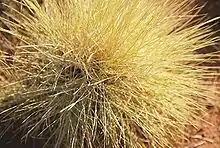 The prickly hard spinifex hummocks have enormous root systems that prevent desert sands shifting. The hummock roots spread underground beyond the prickly clump and deeply into the soil, forming an immense cone. Anangu use a resin gathered from the gummy spinifex to make gum. They thresh the spinifex until the resin particles fall free. These particles are heated until they fuse together to form a moldable black tar which Anangu work while warm. The gum is used for hunting and working implements, and to mend breaks in stone and wooden implements.