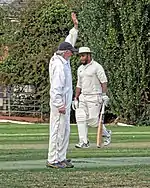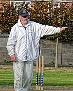 The umpire's response is either to raise their index finger above their head to indicate that the batsman is out, or to clearly say "not out", which is usually accompanied with a shake of the head.[4] The 'out' signal is the only signal that, if indicated by the striker's end umpire, does not require confirmation by the bowler's end umpire.[5]