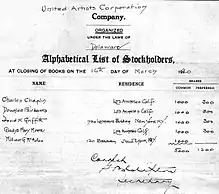 United Artists Corporation (UA) was an American production and distribution company founded in 1919 by D.W. Griffith, Charlie Chaplin, Mary Pickford and Douglas Fairbanks as a venture premised on allowing actors to control their own interests rather than being dependent upon commercial studios.[2]