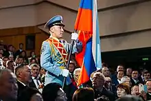 United Russia supports the policies of the incumbent President of Russia, Vladimir Putin, who previously served as party leader during the presidency of Dmitry Medvedev; despite not currently being the official leader or a member of the party, Putin operates as its de facto leader.[24] The party peaked in the 2007 Russian legislative election with 64.3% of the vote, while in recent years, it has seen its popularity decline.[25] The party's ideology has been inconsistent but embraces specific politicians and officials[26] who hold various political views but support Putin.[27] The party appeals mainly to pro-Putin and non-ideological voters[28][29] and is often classified by political scientists as a "big-tent party"[30][31][32][33] or as a "party of power",[34][35][36][37][38][39] meaning that it is the most influential Russian political force that makes major political decisions. In 2009, it proclaimed Russian conservatism as its official ideology.[5][40]