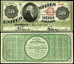 - 1861: Three-year $50 Interest Bearing Notes were issued that paid a cent of interest per day, and thus 7.3% annually — the so-called seven-thirties. These notes were not primarily designed to circulate and were payable to the original purchaser of the dollar bill. The obverse of the note featured a bald eagle.