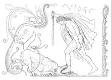 In Norse mythology, Víðarr (Old Norse: [ˈwiːðɑrː], possibly "wide ruler",[1] sometimes anglicized as Vidar /ˈviːdɑːr/, Vithar, Vidarr, and Vitharr) is a god among the Æsir associated with vengeance. Víðarr is described as the son of Odin and the jötunn Gríðr and is foretold to avenge his father's death by killing the wolf Fenrir at Ragnarök, a conflict he is described as surviving. Víðarr is attested in the Poetic Edda, compiled in the 13th century from earlier traditional sources, the Prose Edda, written in the 13th century by Snorri Sturluson, and is interpreted as depicted with Fenrir on the Gosforth Cross. A number of theories surround the figure, including theories around potential ritual silence and a Proto-Indo-European basis.