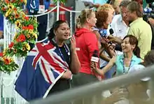 Adams won her fourth world championship gold at the 2013 World Championships games in Moscow in August 2013.[18] Her fourth gold medal surpassed Astrid Kumbernuss for most all time by a female shotputter and made her the first woman to win four straight titles in an event at the competition.[19] On 27 September, Adams underwent surgery on her left ankle and right knee,[20] and in March 2014 won her third world indoor championship at Sopot in Poland with a distance of 20.67 m. Her gold medal at the 2014 Commonwealth Games, where she was New Zealand's flag-bearer, was her 54th consecutive event win; the streak began in August 2010.[21]