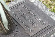 On April 25, 1988, at the age of 52, Valerie Solanas died of pneumonia at the Bristol Hotel in the Tenderloin district of San Francisco.[83] A building superintendent at the hotel, not on duty that night, had a vague memory of Solanas: "Once, he had to enter her room, and he saw her typing at her desk. There was a pile of typewritten pages beside her. What she was writing and what happened to the manuscript remain a mystery."[13][84] Her mother burned all her belongings posthumously.[13]