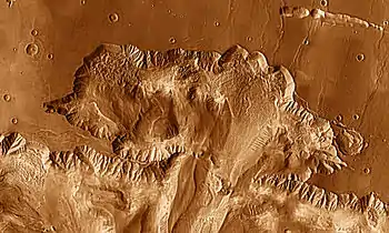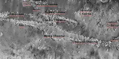 Further to the east from Oudemans, Ius and Tithonium chasmata are located parallel to each other, Ius to the south and Tithonium to the north. Ius is the wider of the two, leading to Melas Chasma. Ius has a ridge down the center of it by the name of Geryon Montes, composed of the undivided basement rock. The floor of Ius Chasma is mostly composed of pristine landslide material, not much degraded by cratering or erosion. The southern wall of Ius, and to a lesser extent the northern wall, has many short valleys stretching off roughly perpendicular to the line of the chasmas. These valleys have a stubby theater-headed leading edge very much like features seen on the Colorado Plateau near the Grand Canyon that appear from groundwater sapping. (Theater-headed means that, from above, the head of the valley is a well-defined U-shape). The valley is propagated by the continued erosion and the collapse of the wall.[13] Tithonium Chasma is very similar to Ius, except it is lacking the sapping features on the south side and contains a small portion of material that is similar to the smooth floor features except that it appears to be an ash fall that has been eroded by the wind. Between the two canyons, the surface is composed of younger fractured material - lava flows and faults from crustal extension of the Tharsis Bulge.[11]