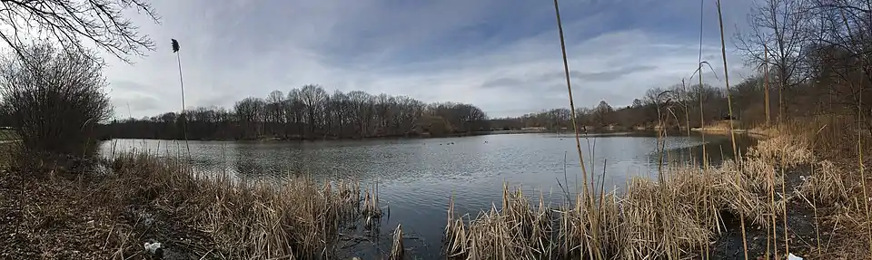 Van Cortlandt Park contains the Bronx's largest freshwater lake, the eponymous Van Cortlandt Lake.[187] The lake is 4 to 8 feet (1.2 to 2.4 m) deep at various times of year, and has an area of 18 acres (7.3 ha).[190] The lake is used for recreational fishing,[191] as it includes species such as largemouth bass, black crappie, brown bullhead, bluegill, pumpkinseed, golden shiner, common carp, white sucker, and yellow perch.[190][192] It is fed by Tibbetts Brook, a stream originating in Yonkers, which runs through a series of culverts before draining into the south edge of the lake at approximately West 242nd Street.[22][132][193] There are efforts to daylight this south end into the former New York and Putnam Railroad right-of-way that runs through the park[178][194] as part of the park's faster plan.[195]