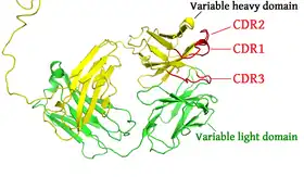 The variable domains can also be referred to as the FV region. It is the subregion of Fab that binds to an antigen. More specifically, each variable domain contains three hypervariable regions – the amino acids seen there vary the most from antibody to antibody. When the protein folds, these regions give rise to three loops of β-strands, localized near one another on the surface of the antibody. These loops are referred to as the complementarity-determining regions (CDRs), since their shape complements that of an antigen. Three CDRs from each of the heavy and light chains together form an antibody-binding site whose shape can be anything from a pocket to which a smaller antigen binds, to a larger surface, to a protrusion that sticks out into a groove in an antigen. Typically however only a few residues contribute to most of the binding energy.[2]