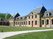 The entrance front of the main château is characteristically French, with the two lateral pavilions flanking a central avant-corps, again reminiscent of Mansart's work at Maisons. Le Vau supplements these with two additional receding volumes between the pavilions and the central mass. All of these elements are further emphasized with steep pyramidal caps. Such steep roofs were inherited from medieval times and, like brick, were rapidly going out of fashion. Le Vau would never use them again. The overall effect at Vaux, according to Andrew Ayers, is "somewhat disparate and disorderly".[16] Moreover, as David Hanser points out, Le Vau's elevation violates several rules of pure classical architecture. One of the most egregious is the use of two, rather than three, bays in the lateral pavilions, resulting in the uncomfortable placement of the pediments directly over the central pilaster.[18] Ayers does concede however that, "although rather ungainly, the entrance facade at Vaux is nonetheless picturesque, in spite, or perhaps because, of its idiosyncrasies."[19]