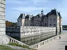 The main château is constructed entirely on a moated platform, reached via two bridges, both aligned with the central axis and placed on the north and south sides. The moat is a picturesque holdover from medieval fortified residences, and is again a feature that Le Vau may have borrowed from Maisons. The moat at Vaux may also have been inspired by the previous château on the site, which Le Vau's work replaced.[16]