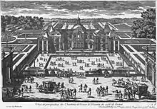The bridge over the moat on the north side leads from the avant-cour to an ample forecourt, flanked by raised terraces on either side, a layout evoking the cour d'honneur of older aristocratic houses in which the entrance court was enclosed by anterior wings, typically housing kitchens and domestic quarters. Le Vau's terraces even terminate in larger squares suggesting former pavilions. In more modern residences, like Vaux, it had become the custom to put these facilities in the basement, so these structures were no longer needed. This U-shaped plan of the house with the terraces is a device that again recalls Maisons, where Mansart intended "to indicate that his château was conceived in a noble tradition of French design while at the same time emphasizing its modernity in comparison to predecessors."[17]