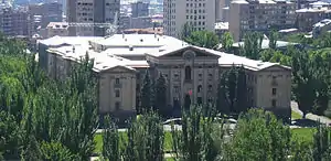 Official results, which recorded Ter-Petrosyan's victory in the first round with just above 50% of the total vote in his favor,[55] were denounced by opposition candidate Vazgen Manukyan who had officially received 41% of the vote. Manukyan began demonstrations claiming electoral fraud by Ter-Petrosyan's supporters. The protests culminated on 25 September, when Manukyan led thousands of his supporters to the parliament building on Baghramyan Avenue, where the Electoral Commission was located at the time. Later during the day, the protesters broke the fence surrounding the parliament and entered the building. They beat up the parliament speaker Babken Ararktsyan and vice-speaker Ara Sahakyan.[56] In response, Vazgen Sargsyan stated that "even if they [the opposition] win 100 percent of the votes, neither the Army nor the National Security and Interior Ministry would recognize such political leaders." He was later criticized by human rights organizations for this statement.[57] State security forces, tanks and troops were deployed in Yerevan to restore order and to enforce the ban on rallies and demonstrations on 26 September.[58] Sargsyan and National Security Minister Serzh Sargsyan announced that their respective agencies had prevented an attempted coup d'état.[59]
