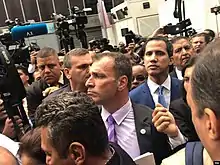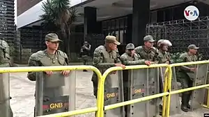 Juan Guaidó, the newly appointed president of the National Assembly of Venezuela, began motions to form a provisional government shortly after assuming his new role on 5 January 2019, stating that whether or not Maduro began his new term on the 10th, the country would not have a legitimately elected president in either case.[87] On behalf of the National Assembly, he stated that the country had fallen into a de facto dictatorship and had no leader,[88] declaring that the nation faced a state of emergency.[89] Guaidó called for "soldiers who wear their uniforms with honor to step forward and enforce the Constitution", and asked "citizens for confidence, strength, and to accompany us on this path".[89]