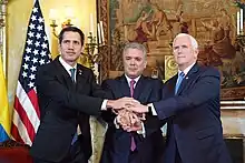 OAS Secretary-General Luis Almagro was the first to give official support to this action, tweeting "We welcome the assumption of Juan Guaidó as interim president of Venezuela in accordance with Article 233 of the Political Constitution. You have our support, that of the international community and of the people of Venezuela."[97] Later that day, Brazil and Colombia gave their support to Guaidó as acting president of Venezuela.[105] The United States would simultaneously broaden sanctions against Venezuela's economy targeting oil sales.[101] H. R. McMaster's aide Fernando Cutz, discussing the sanctions, said that "everybody also thought it was going to be very devastating from a humanitarian perspective" after economists advised the United States National Security Council about the issue.[101] Guaidó would later praise the sanctions and demanded that the European Union institute its own.[101]