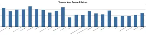 The series was critically acclaimed, and appeared on several fall television best lists.[1] The second season garnered an average of 2.3 million viewers per all 22 episodes in the US. Out of all regular primetime programming that aired during the 2005–2006 American television season, Veronica Mars ranked 145th out of 156, according to the Nielsen ratings system.[2] The premiere was watched by 3.30 million viewers,[3] while the finale was watched by 2.42 million viewers.[4]