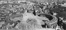 Plans were drawn up several times over the years for the construction of a major link between the Vatican City and the centre of Rome; the number of submissions increasing dramatically with the onset of the Italian Renaissance. The first design was submitted by Leone Battista Alberti during the reign of Pope Nicholas V,[6] and formed one of the two perennial designs proposed for the area. Alberti envisioned an "open" plan, consisting of a single voluminous V-shaped boulevard, widest at St. Peter's Basilica itself and tapering as it approached the Tiber. The other scheme of designs submitted by architects was a "closed" plan that would consist of two roads arching outwards in an ellipse, with the Tiber and the Square at opposite ends. Proponents of a closed plan would usually suggest that the space between the two causeways be separated by a colonnade, or by a row of inhabited structures whose designs would be scrutinised and approved by architects employed by the Holy See. Variations on both themes were submitted time and time again. Proponents of an "open" plan included such architects as Giovanni Battista Nolli and Cosimo Morelli.[7][8] A number of other architects, such as Carlo Fontana, and at least one Pope (Sixtus V) favoured a "closed" design, with a number of streets radiating from the central square, maintaining the "spina", or spine, of the structures of Borgo directly between the square and the Tiber.[9] Neither approach moved beyond sketches and blueprints. Both open and closed designs were considered by the Vatican, but were ultimately discarded for reasons of expense. A thorough examination of the costs of constructing a thoroughfare was made by the Vatican-approved St. Peter's Building Commission in 1651. Their conclusion was that "the cardinals' proposal to demolish all the buildings between the Borgo Nuovo and the Borgo Vecchio for a greater and longer vista to the church" would be infeasible due to inordinately high expropriation costs and vested property interests.[7]
