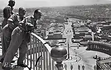Demolition of the spina of Borgo began with Mussolini's symbolic strike of the first building with a pickaxe on 29 October 1936 and continued for twelve months. Even at the time, the demolition proved controversial, with many Borgo residents displaced en masse to settlements ("borgate") outside of the city.[14] Among the buildings dismantled, either totally or in part, and rebuilt in another position, were the Palazzo dei Convertendi, the house of Giacomo Bartolomeo da Brescia, the Church of the Nunziatina, and the palaces Rusticucci-Accoramboni and degli Alicorni (the latter had been already demolished in 1931). Other buildings, including the palace of the Governatore di Borgo and the Churches of San Giacomo Scossacavalli and Sant'Angelo al Corridore, were not rebuilt after their destruction. Facing into the cleared area are five other historical buildings, the Palazzo Giraud Torlonia, the church of Santa Maria in Traspontina, the Palazzo dei Penitenzieri, Palazzo Serristori, and Palazzo Cesi (which was mutilated).[15]