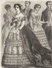 Clothes were seen as an expression of women's place in society,[3] hence were differentiated in terms of social class. Upper-class women, who did not need to work, often wore a tightly laced corset over a bodice or chemisette, and paired them with a skirt adorned with numerous embroideries and trims; over layers of petticoats. Middle-class women exhibited similar dress styles; however, the decorations were not as extravagant. The layering of these garments make them very heavy. Corsets were also stiff and restricted movement. Although the clothes were not comfortable, the type of fabrics and the numerous layers were worn as a symbol of wealth.
