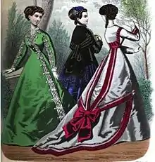 During the early and middle 1860s, crinolines began decreasing in size at the top, while retaining their amplitude at the bottom.[8] In contrast, the shape of the crinoline became flatter in the front and more voluminous behind, as it moved towards the back since skirts consisted of trains now. Bodices on the other hand, ended at the natural waistline, had wide pagoda sleeves, and included high necklines and collars for day dresses; low necklines for evening dresses. However, in 1868, the female silhouette had slimmed down as the crinoline was replaced by the bustle, and the supporting flounce overtook the role of determining the silhouette.[9] Skirt widths diminished even further, while fullness and length remained at the back. In order to emphasise the back, the train was gathered together to form soft folds and draperies[10]