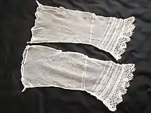 Extra layers of flounces and petticoats, also further emphasised the fullness of these wide skirts. In compliance with the narrow waist though, skirts were therefore attached to bodices using very tight organ pleats secured at each fold.[5] This served as a decorative element for a relatively plain skirt. The 1840s style was perceived as conservative and "Gothic" compared to the flamboyance of the 1830s.[7]